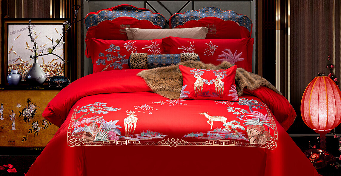 红棉婚庆床品《一生相伴》产品,采用华美的大提花面料,清爽透气,舒适亲肤。唯有牡丹真国色,雨兰这款床品还融入了寓意美好的——麋鹿,精致唯美,高贵大气,为婚礼增添了喜庆之气,寓意幸福圆满,雍容华贵。通过红色的配色和工艺处理,烘托出了婚礼华丽而浪漫的欢快的节奏。