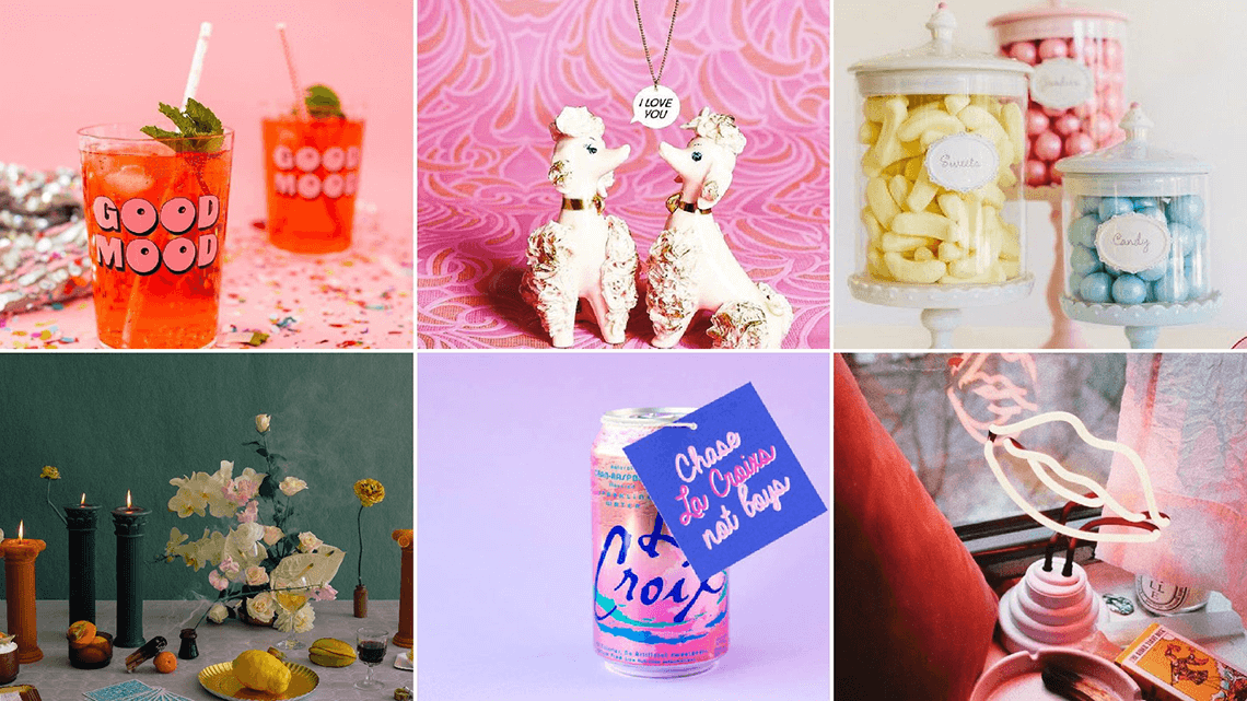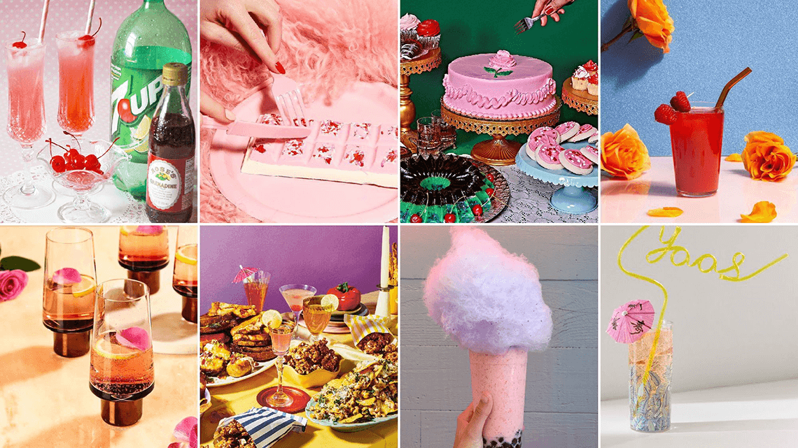 食物&饮品的外观额外古怪,鲜艳的饱和亮色与糖果粉彩色形成鲜明对比,词汇装饰着食品和餐具,幽默的语录和俚语取代了爱的宣言。冰淇淋圣代和夏威夷饮品等复古美食为节日带来一种怀旧感,食物更加注重感官上的享受,例如诱人的松脆和柔软的口感相搭配,或将咸咸的质感和甜甜的味道味放在一起。