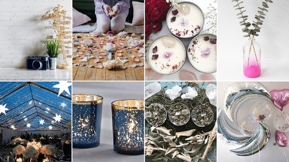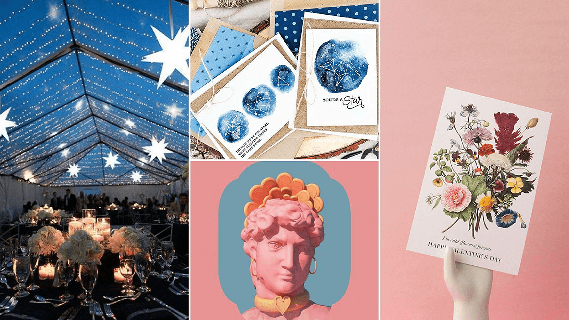 从天然玉石和月球表面中汲取灵感,设计印花和图案。使用天然材料,形成个性化的外观,并增添个人元素,如爱人的生肖符号或喜爱的花束中的干花。使用星座图案,搭配上年轻人青睐的排版或手绘书法,传达个性化的外观。
