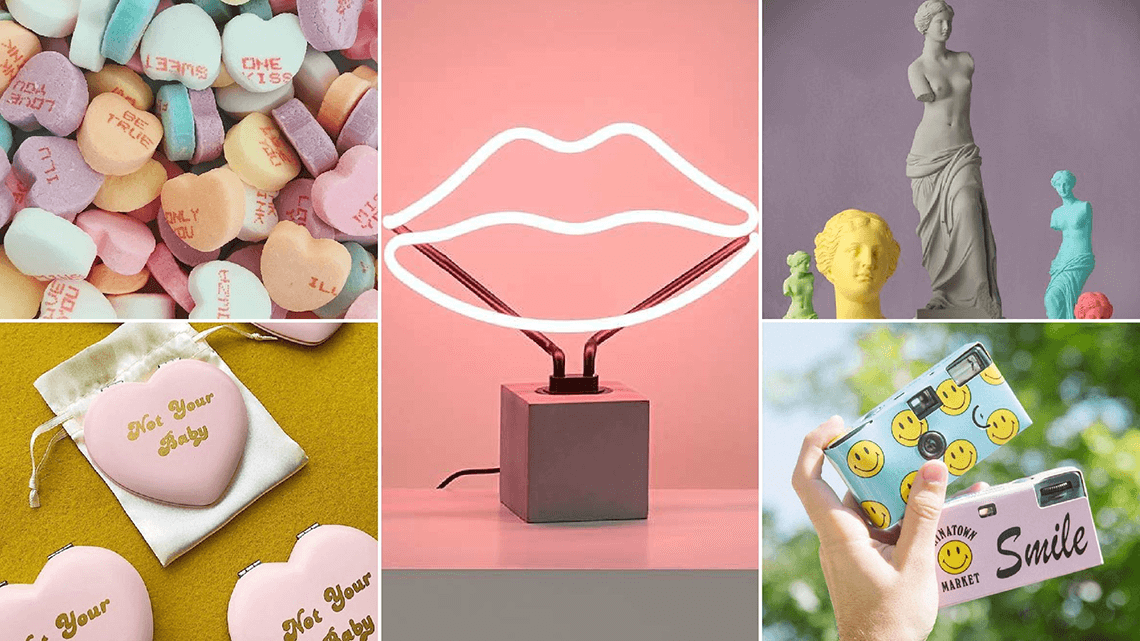 印花和图案的设计从多个时代中汲取灵感,包括让人想起上世纪70年代的字体和本世纪的笑脸图标,赋予情人节产品当代感以及幽默感,例如讽刺的短句,这些短句一般都是在庆祝单身,并嘲笑该节日 。积极性很重要,设计关注能改善情绪的色彩和令人愉悦的引用,以包容性的方式表达着爱。