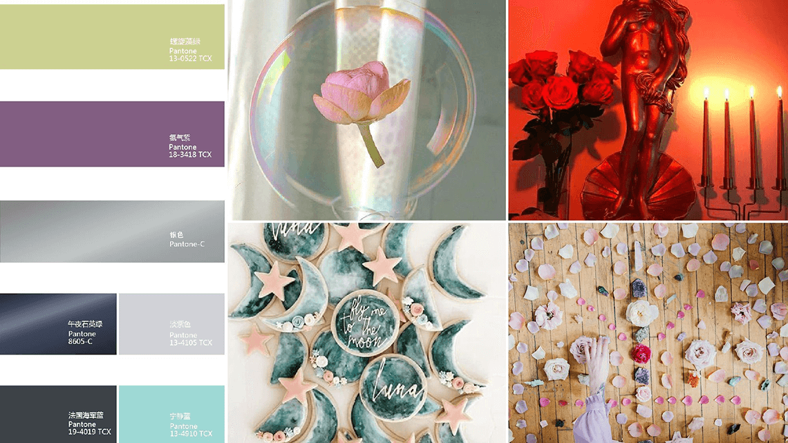 异变探索了未来设计中的自然力量,从海洋深处到古代炼金术和天文学。 就情人节而言,这可以被释意为聚焦自我宠爱、日常仪式感和超凡脱俗的解读。从日月星辰中汲取灵感,形成充满酷蓝色、银色、淡紫色和青柠绿的调色板,在设计中融入灵性和神秘主义等特征,包括月相和占星术等图标。